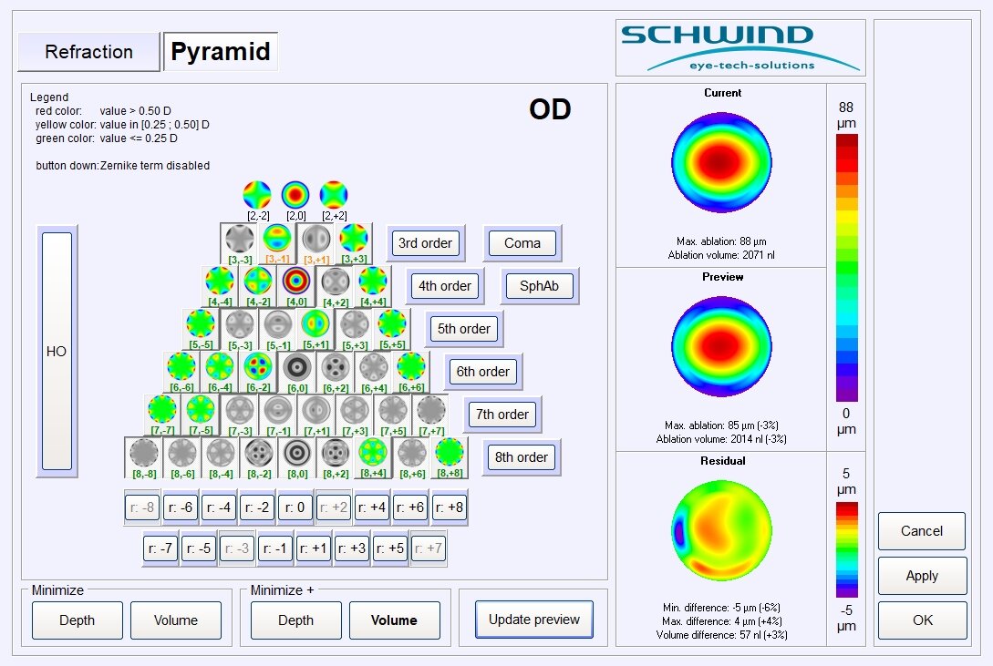 SCHWIND treatment planning includes the data of uniquely high-resolution diagnostic devices that support to make the SCHWIND AMARIS® treatment maximally personalized. The AMARIS® is programmed based on detailed measurements of each individual patient’s eye, which includes the cornea and the lens of the eye. Beside a refraction optimization function, all aberrations to be removed can be identified automatically within the intelligent SCHWIND treatment planning software – ensuring minimal tissue removal without any compromise on visual acuity. As a result, SCHWIND AMARIS® ablates a patient eye individual treatment profile with the target to save as much as possible tissue, maintain high corneal stability and achieve best possible vision.